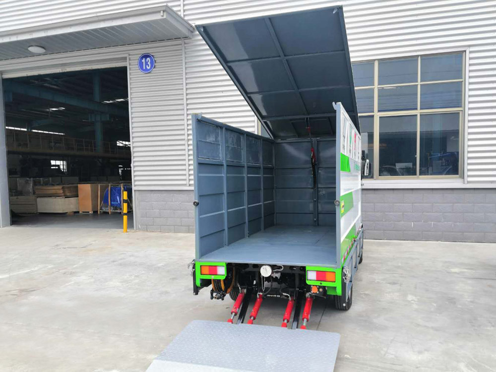 ◆ Hydraulic system: 72V DC motor double cylinder four-bar hydraulic device, which can be operated by wire or wireless remote control to control the tailboard operation. The top cover is hydraulically lifted, which is firm and safe